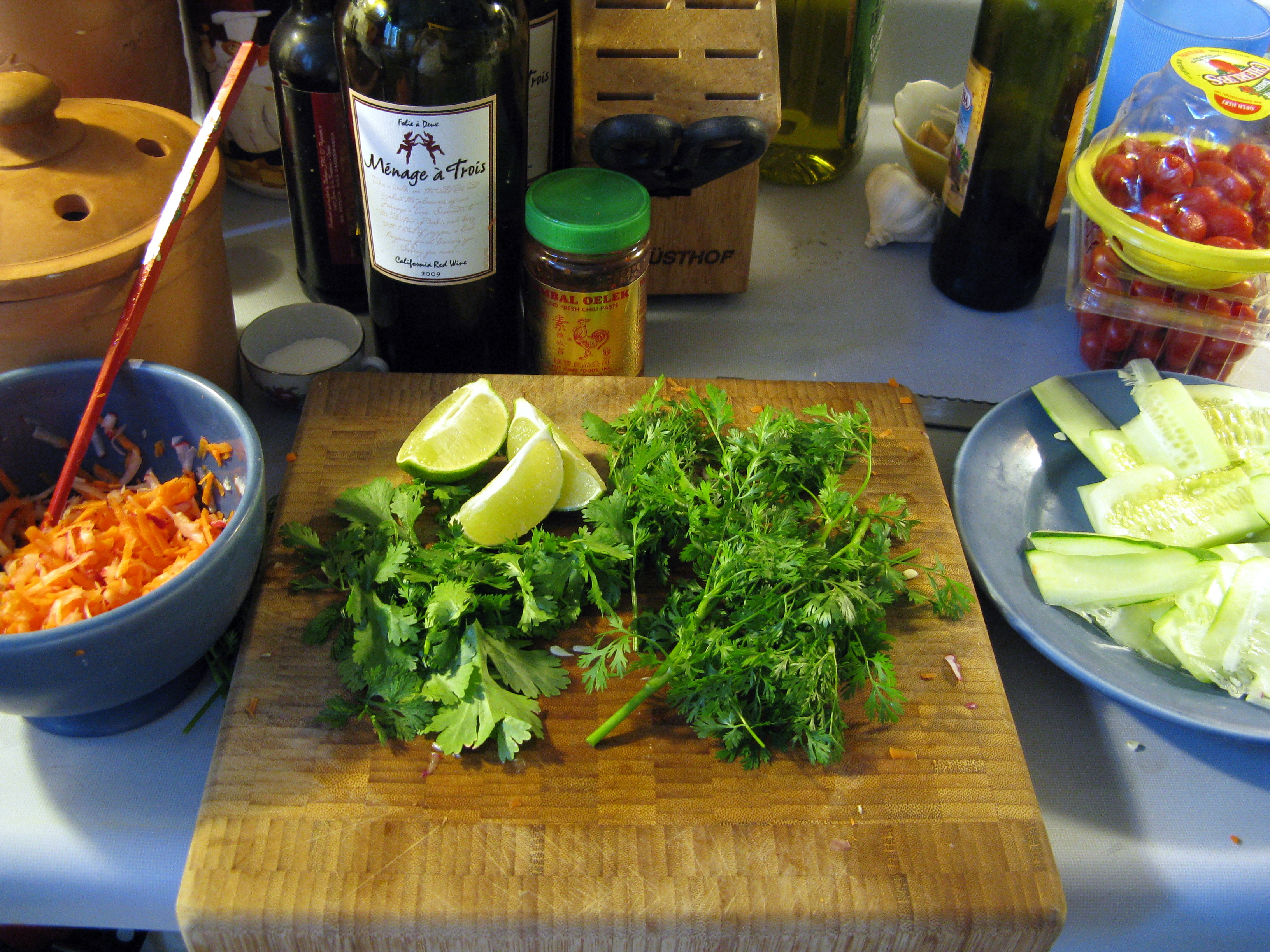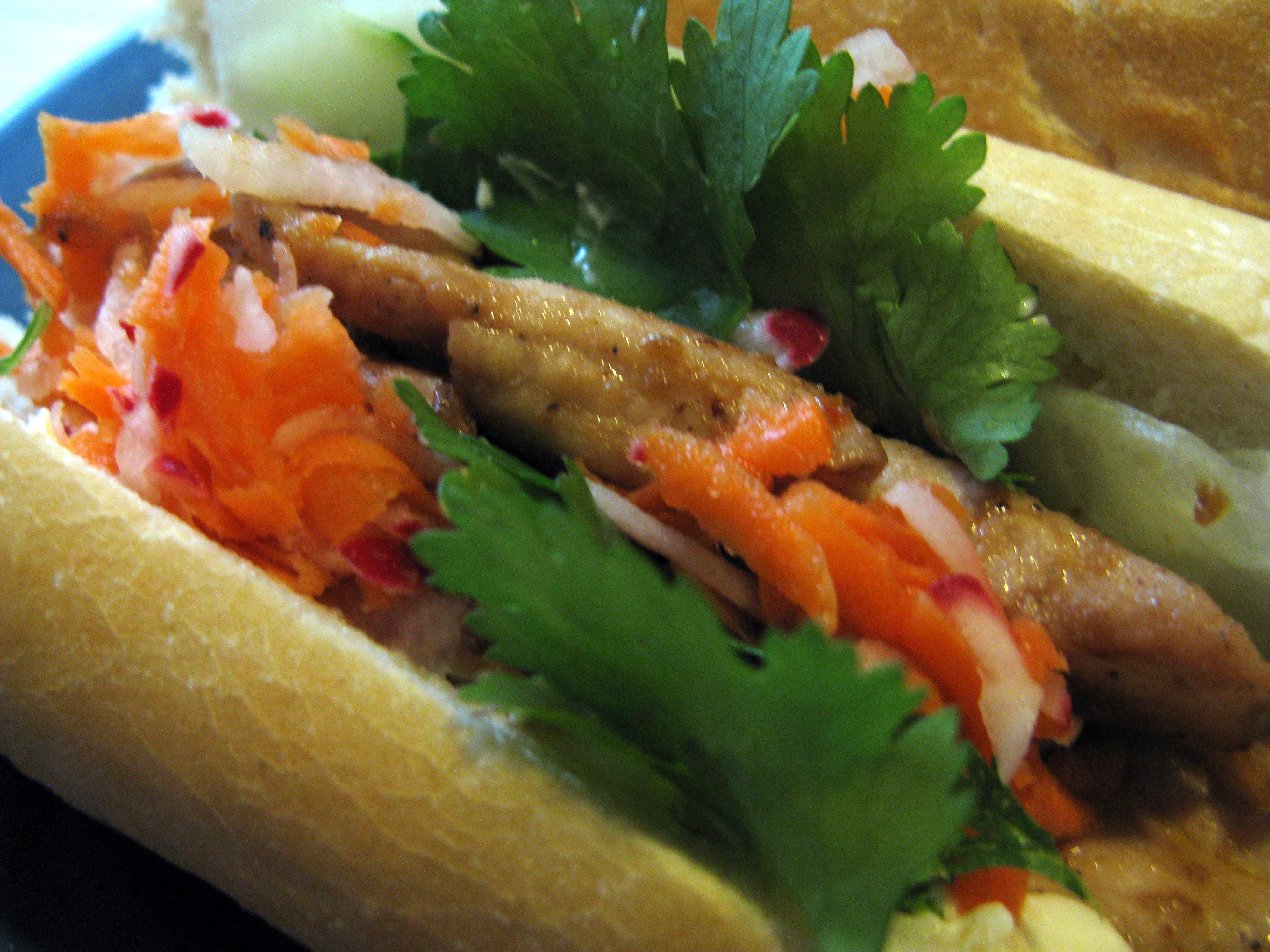 Today was grocery day and I decided to shop with this delightful ingredient in mind. I’ll be doing the same thing with my burgeoning basil and Thai basil plants as it gets further into summer (and tomato season!). Tonight I made the Vietnamese sandwiches called Banh Mi–-something I’ve always drooled over in cookbooks but somehow have never actually had the opportunity to try. Well, no more!
