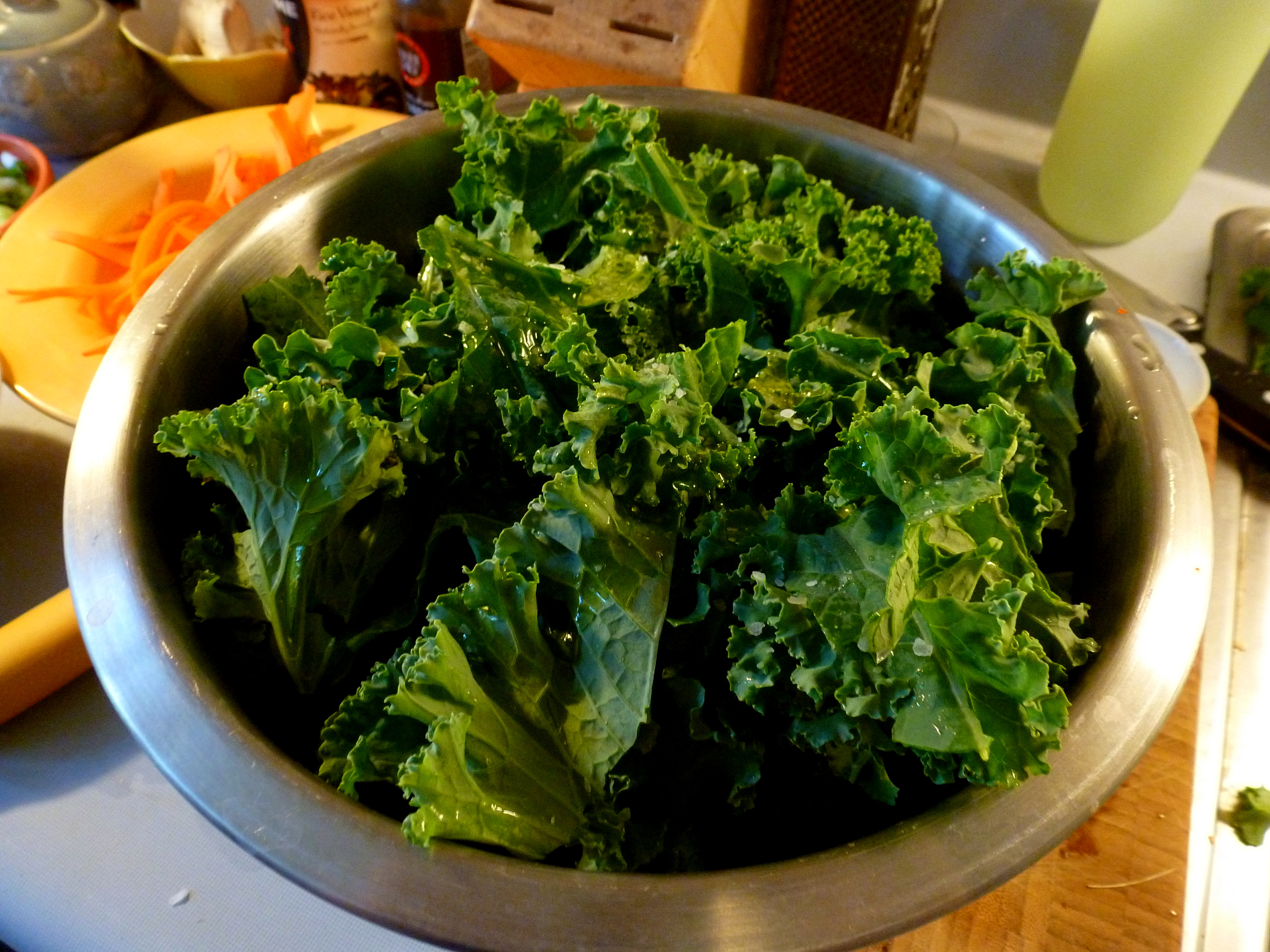 2. Wash kale well (you know you absolutely have to wash your greens, right? E-coli is no joke.)  and remove the center ribs. Tear into bite-sized pieces. Place into a bowl.
