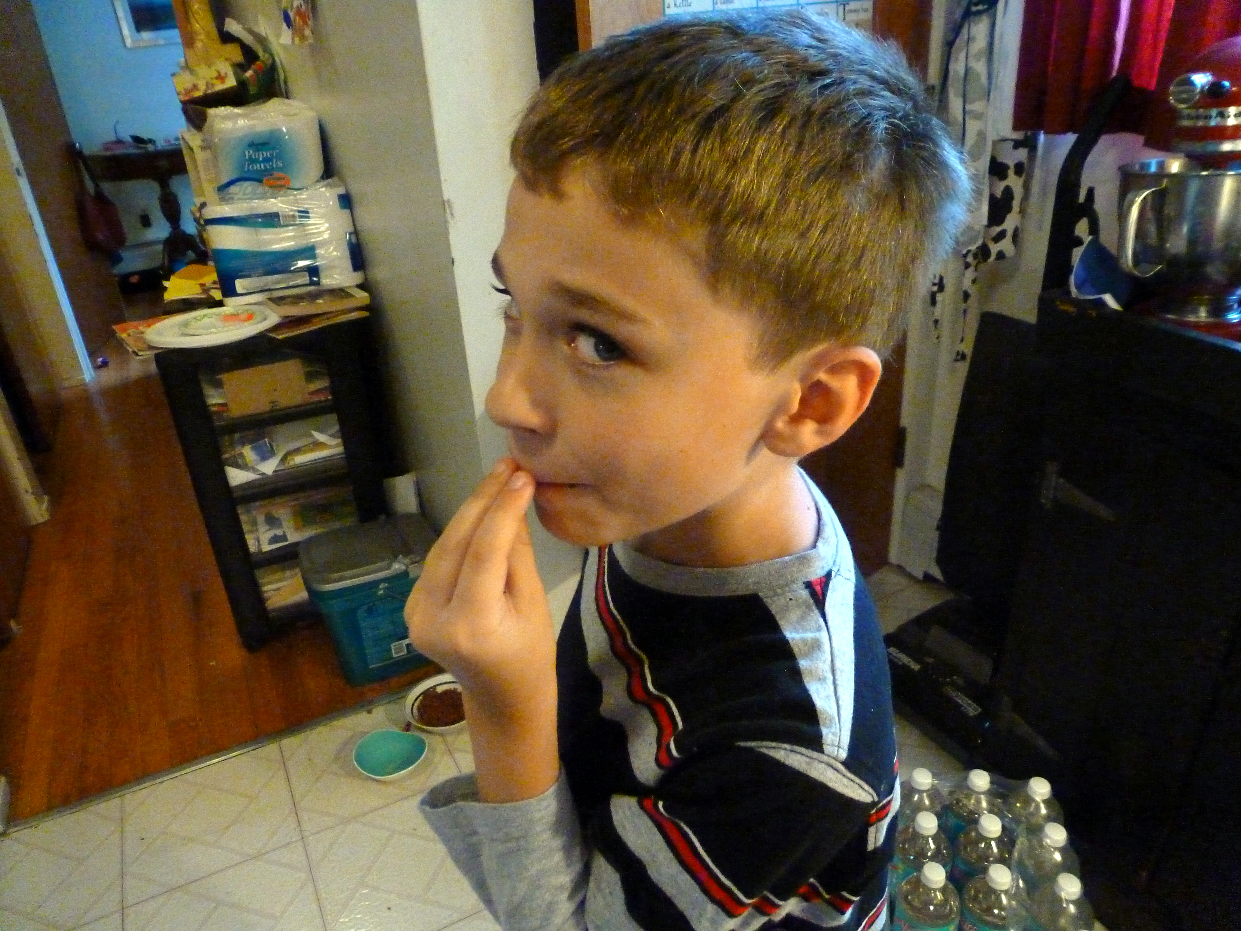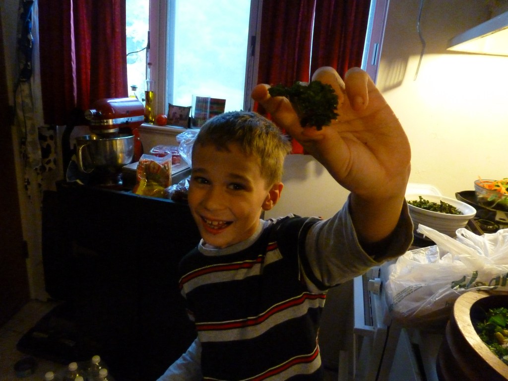 I will have to follow him around with a broom after this, kale crumbling from each bite like so much….kale from a boy’s mouth. Similes, see?