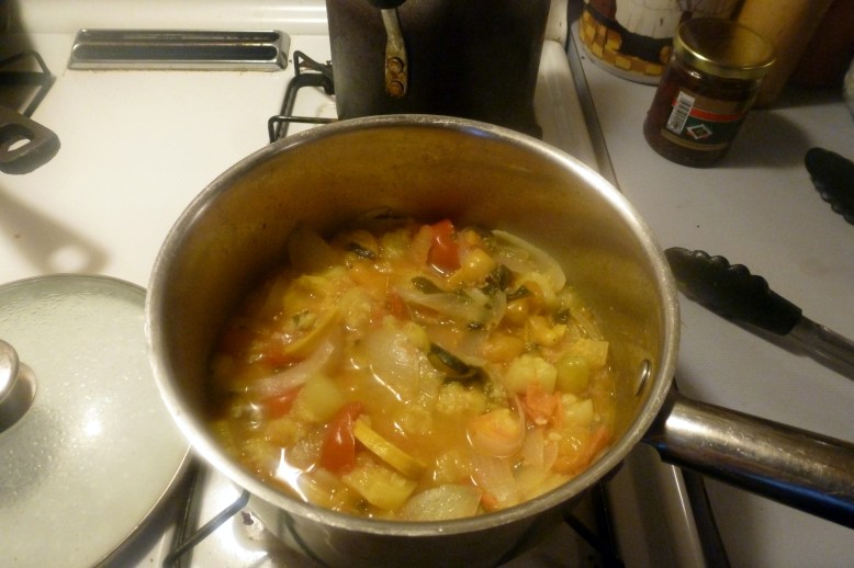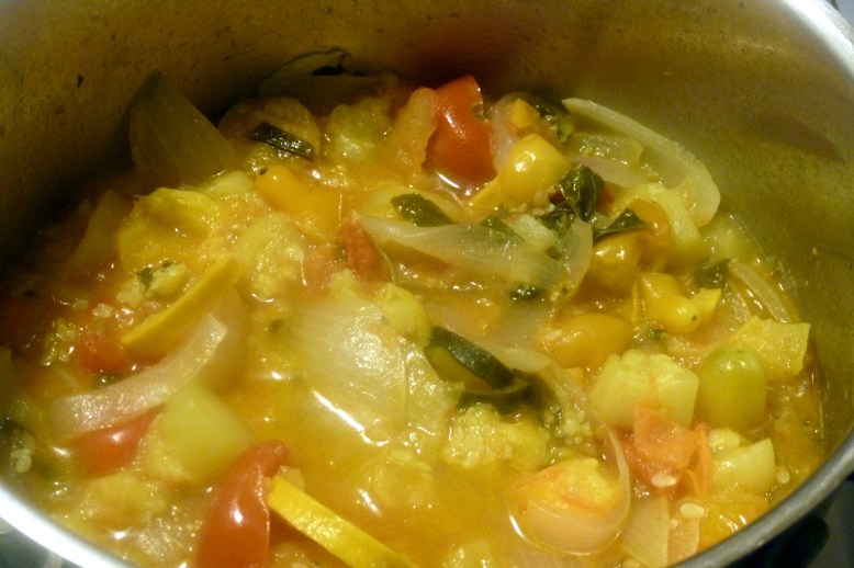 Diced the remaining zukes and added them to the pot with some fresh tomatoes I had (of varying sizes), the thyme and basil I didn’t use in the previous recipe, some salt and pepper and about a cup of water. Brought that whole thing up to a boil, then simmered for a while, until things looked nice and broken down and, yes, mushy. Structural integrity be damned!