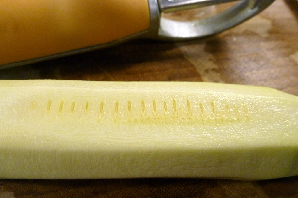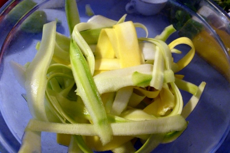 Grab your veggie peeler and remove the skin. Peel the rest of the squash into ribbons, but stop when you start to see the seeds. Even in the small ones, the seeds can still be slightly bitter. Reserve the core of the zuke for another use. (Don’t worry; I’m going to give you some ideas in the next post!)