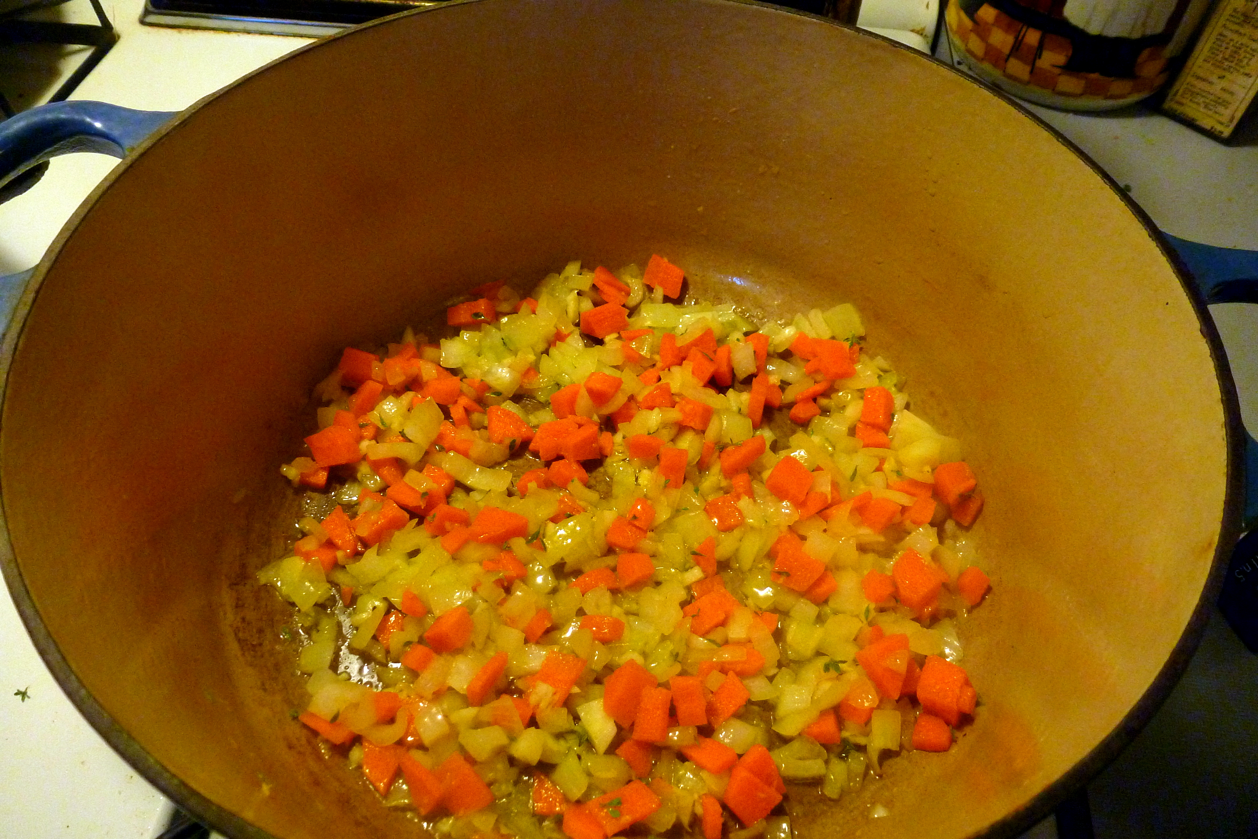 I go at this pretty much the same way I would a meat-based sauce. Heat the oil in a heavy pan and then add the onions, garlic, carrot, some salt and the thyme leaves. Cook until the onions start to soften, being careful not to burn the garlic. Medium low heat is best.