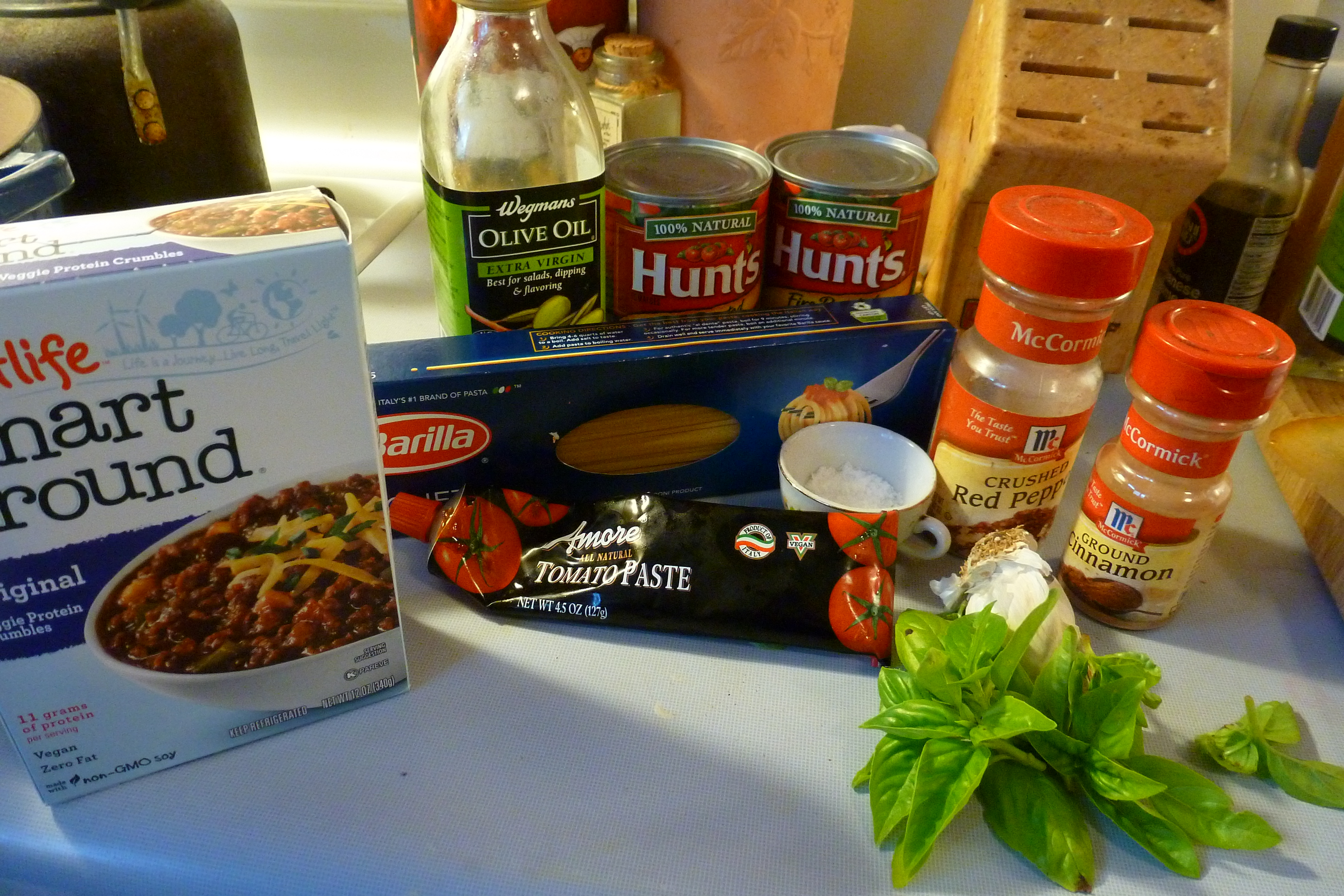 You get it though, right? This is a meatless Bologese-esque preparation, born of our efforts to cut back on factory-farmed meat a few years ago. We’ve done fairly well, I’d say. We’re lucky to be able to source organic meat pretty easily, but as it is certainly pricier, we tend to eat less anyway. We discovered these veggie protein crumbles and like them in lots of dishes that normally call for meat, especially soups, stews and sauces.