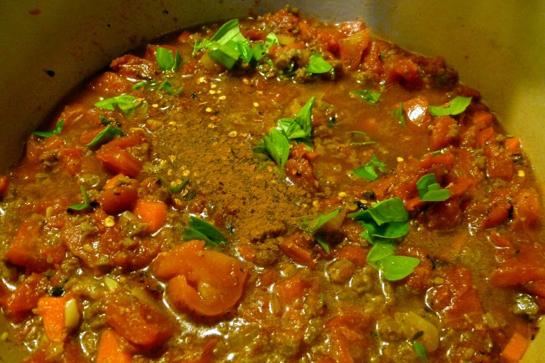 On top of that, the tomatoes and a cup or so of water, depending on how thick a sauce you like. I usually just fill the empty tomato can a few times and add that. Add the basil, crushed red pepper, balsamic vinegar and cinnamon–yes, cinnamon!–now, too.