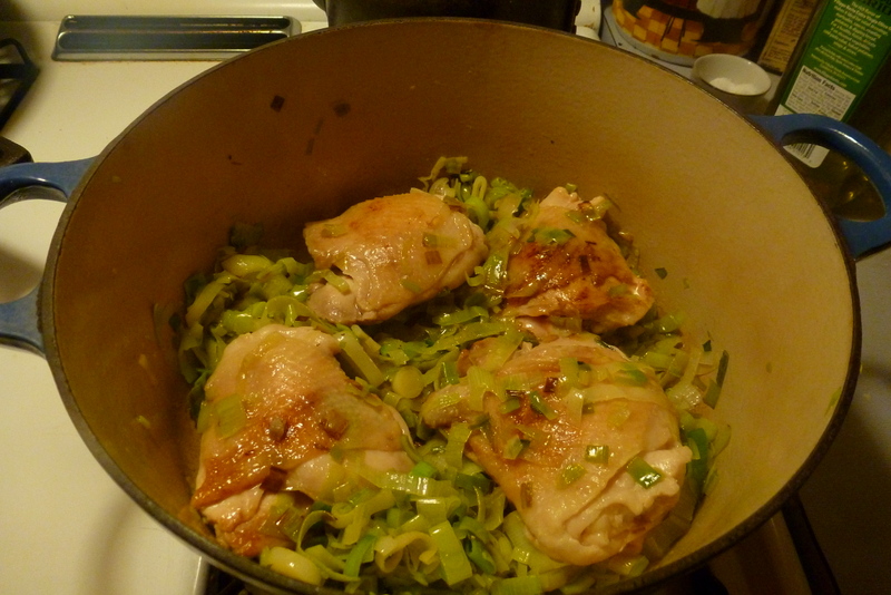 Once the leeks have cooked down, place the chicken thighs skin side down in the pan, nestled among all that green. Turn up the heat a bit. You want to get a little bit of color onto the chicken in this browning. Again, flavor. Trust me.