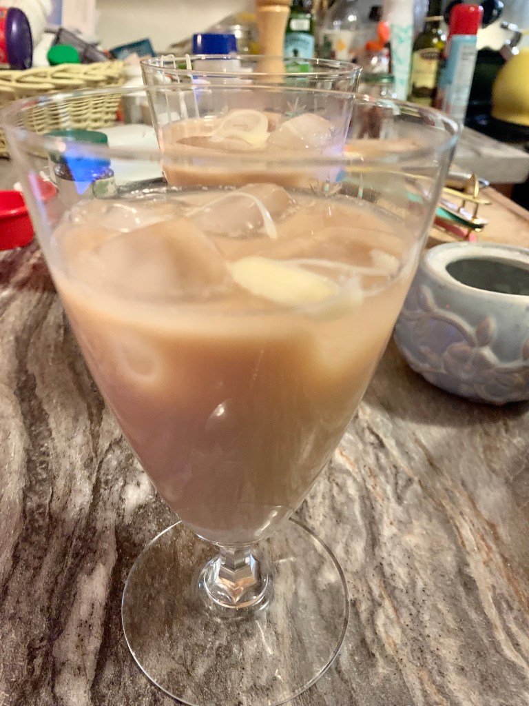 Anyway, all we did was brew some strong black tea (I used Oolong because it’s what I had on hand) and then steep it with a bunch of spices: cardamom pods and cinnamon sticks, slightly crushed, coriander seed, black peppercorns, star anise…I might be forgetting something and also I can’t give you an measurements (see, “winging it” above), but I can say that mixed with condensed milk and poured over ice (with an extra little drizzle on top of the ice cubes) made for a very nice beverage that would be worth making again. My husband wandered into the kitchen as we tasted it and called it “interesting,” but he also came back for seconds.