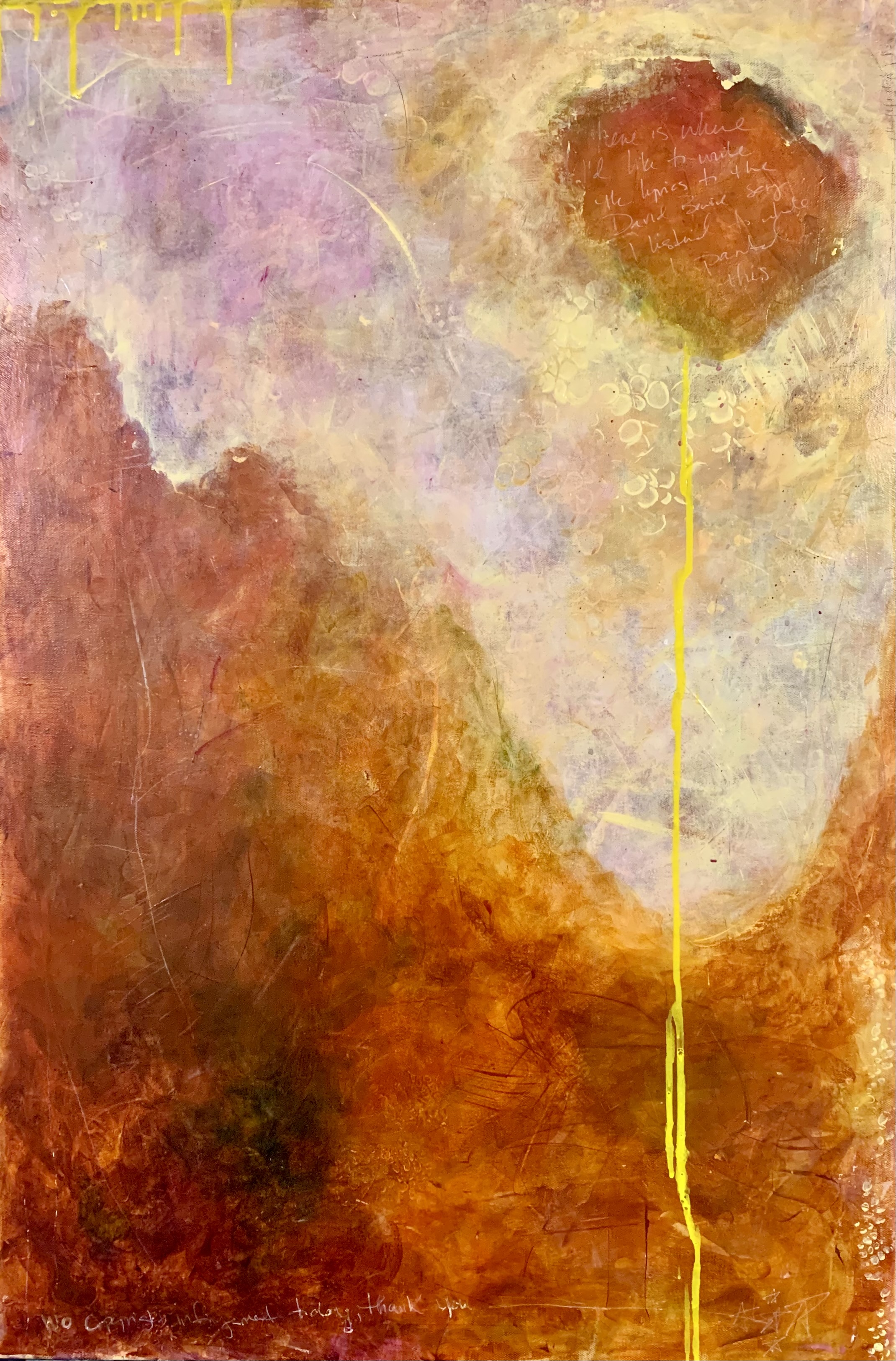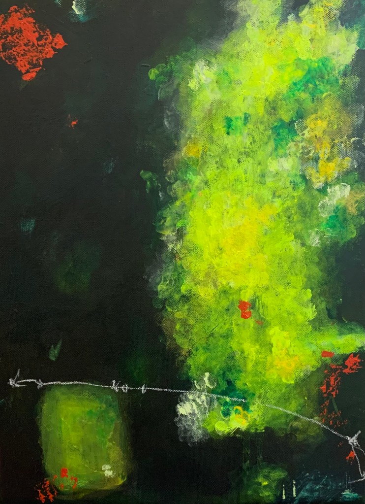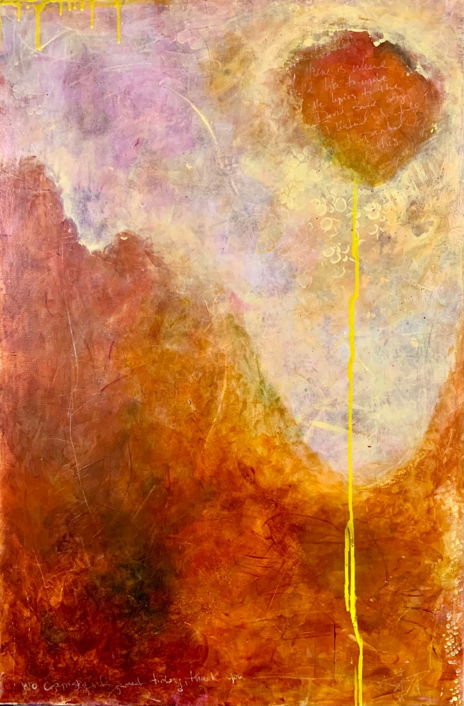 “I hear the flowers talking in the dawn” 16 x 20 “Love Lies Bleeding” 16 x 20 “I’d Like a Do-over, Please” 20×24 “Her Warmth and Her Light” 20 x 24 “The Dawn Was Apple Green” 18×24 “Winter Garden” 16×20 “in these dark cells, packed street after street” 20×20 “all essences of sweetness from the white, warm day go up in vapor” 16×20 “The Long Multitudinous Rain” 20×26 “Yellow she affords, I” I2x16 “Yellow she affords, II” 12×16 “Two Hearts” 24×36 “Starman, Waiting” 24 x36 “When Frost Was Spectre-Grey” 16×20 “Billow and Bound and Bleed” 16 x 20 “Dead Center Headache” 12×16 “Red Inscription” 16 x 20 “Taking My Daughter’s Advice” 16 x 20 ‘My Sister Asks If I’ve Been Crying” 12 x 16“Chasmic Meadow” 18 x 24 “Some Kind of World Comes into View” 20 x 24“In Just Spring, I” 12 x 12“In Just Spring, III” 12 x 12“In Just Spring, V” 12 x 12 “In Just Spring, II” 12 x 12“Participation Trophy” 8×8 on cradled panel
